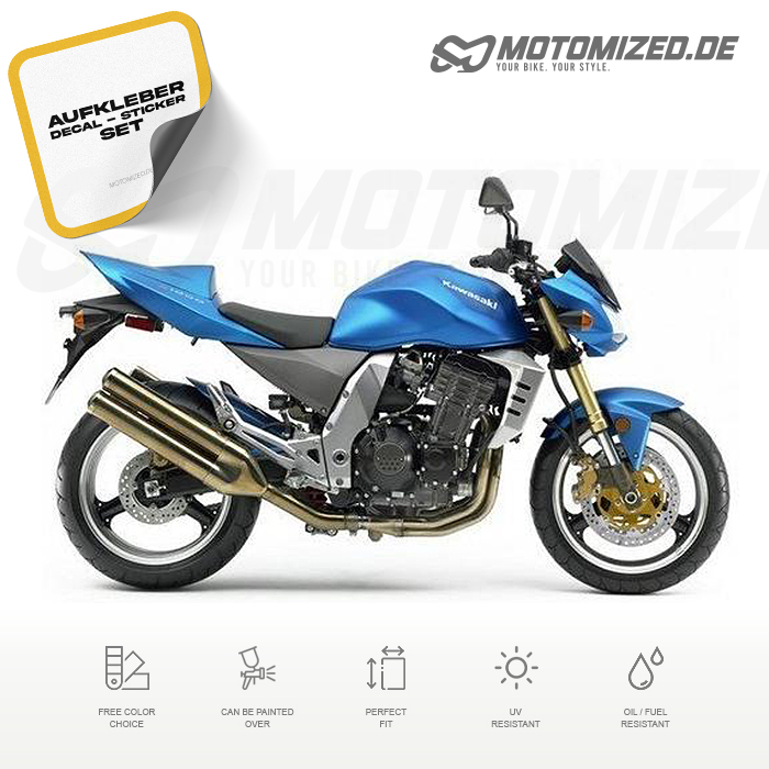 This replica decals includes all shown stickers for the Kawasaki Z1000 2005 in Blue to apply by yourself! The stickers can be applied using the wet or dry method, all the details are shown in our Motomized.de - Sticker-Guide which is included with your order.